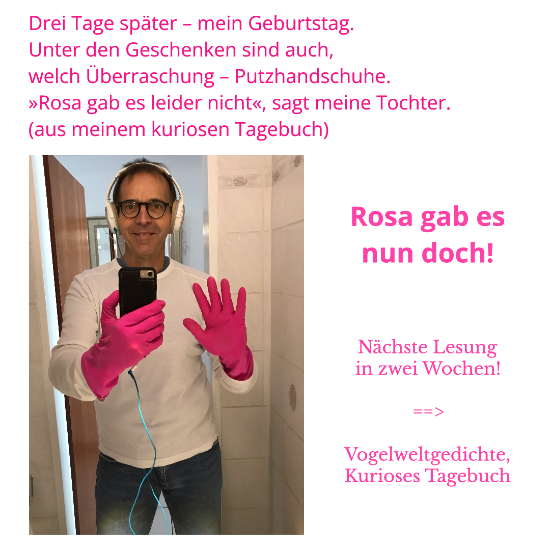 ... Putzhandschuhe. Inzwischen bin ich auf grüne umgestiegen und es sieht ganz danach aus, dass die in meinem kuriosen Tagebuch Teil 2 auftauchen werden. An dem arbeite ich nämlich gerade. Wer mein kurioses Tagebuch nicht kennt, hat echt etwas verpasst. Schaut am besten auch gleich mein Buch mit den humorvollen Vogelweltgedichten an.