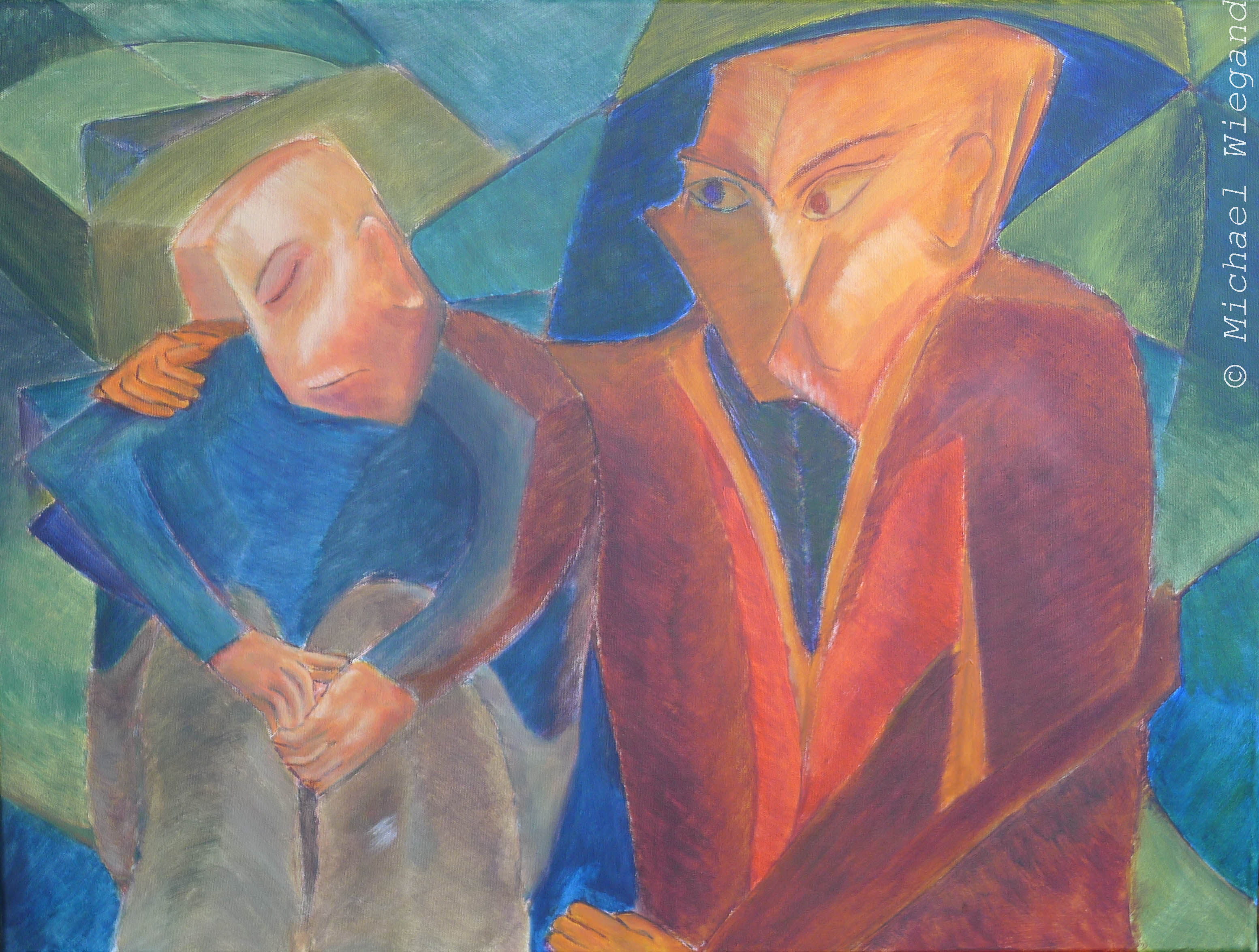 Ganz früh war mir auch klar, dass die Figur auf der rechten Seite die traurige Figur trösten würde, ihr Mut machen. Dafür legte ich ihren Arm um die traurige Figur. Nun ging es noch darum Farben und das ein oder andere Detail zu setzen, bis alles passt, teilweise Partien korrigieren und an der Gesamtwirkung zu arbeiten. Das klingt leichter, als es manches Mal ist und es kann auch schon mal eine ganze Menge Arbeit in Teilen eines Werkes liegen, bis ich damit zufrieden bin. Wichtig finde ich, dass dir selbst gefällt, was du da auf die Leinwand gepinselt hast. Sonst kannst du es am besten gleich wieder mit etwas Neuem übermalen. Als ich mir das fertige Bild in Ruhe anschaute und auf mich wirken ließ, kam mir auch der Titel in den Sinn: Zuversicht (Confiance). Manches Mal gebe ich meinen Bildern einen Namenszusatz auf Französisch, in Erinnerung an meine Maler-Vorbilder aus Frankreich.